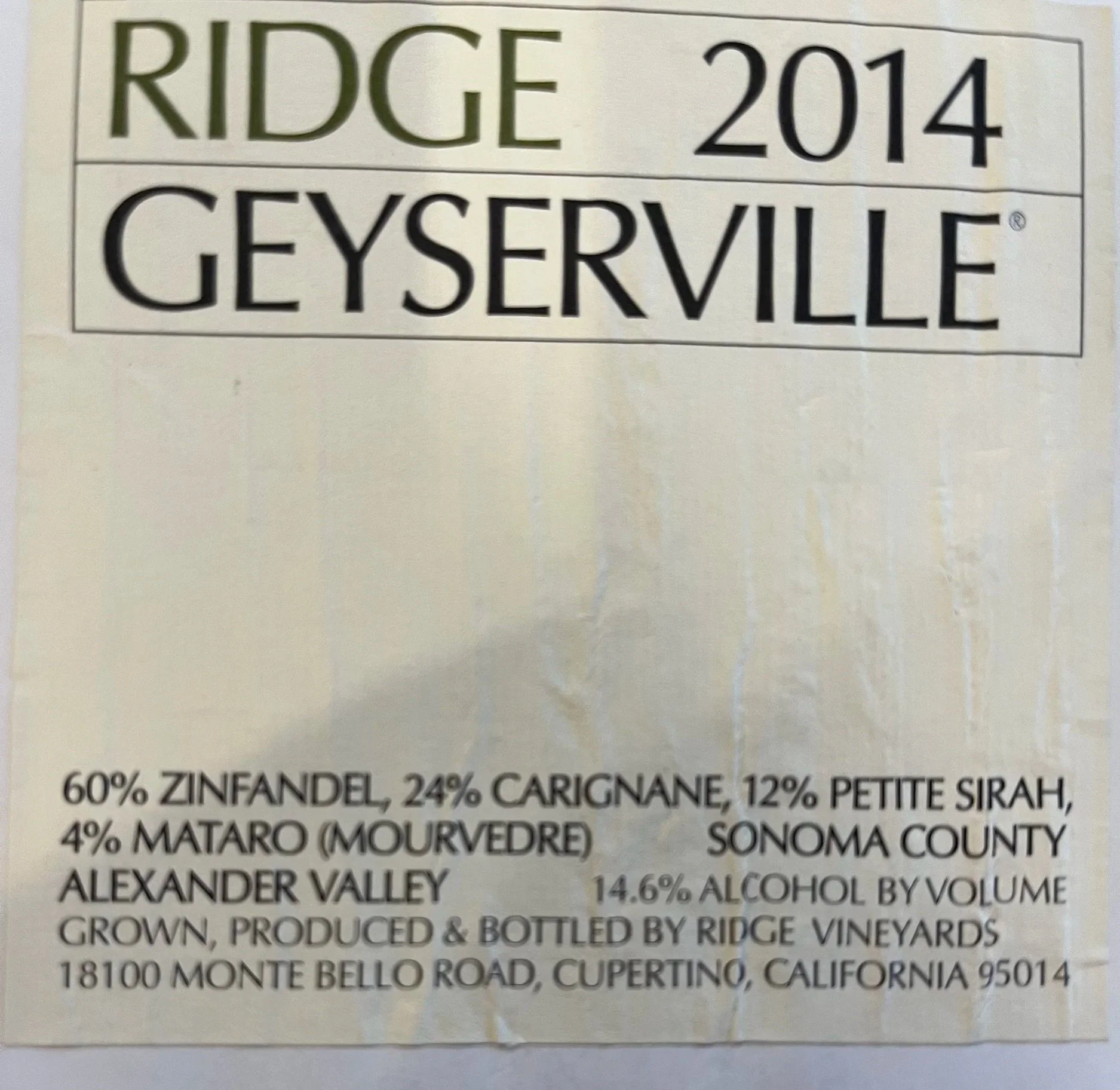 Just the location remains. Zinfandel is gone. Because Ridge is a high end producer, they list the exact percentages.